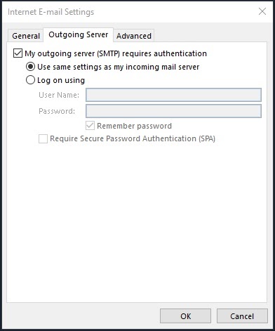 Click the “More Settings” button and then click the “Outgoing Server” tab. Check “My Outgoing server (SMTP) requires authentication”