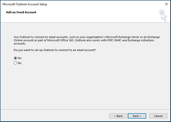 Outlook 2016 is included as part of the Microsoft Office 2016 Suite. After installing select “Yes” and click “Next”.
