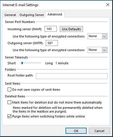 Change “Use the following type of encrypted connections” to “None” in the pull down menu for both Incoming and Outgoing servers.