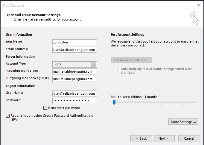 Enter “mail.reliablepenguin.com” in the “Incoming mail server” and “Outgoing mail server (SMTP)” fields.