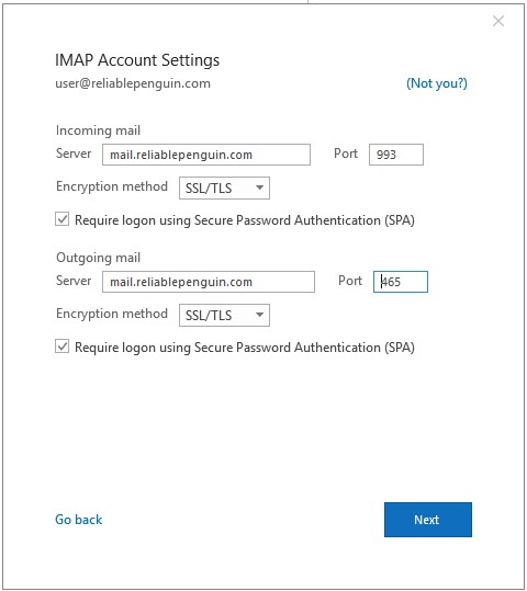 Enter “mail.reliablepenguin.com” in the “Incoming mail” Server field and the “Outgoing mail” Server field.