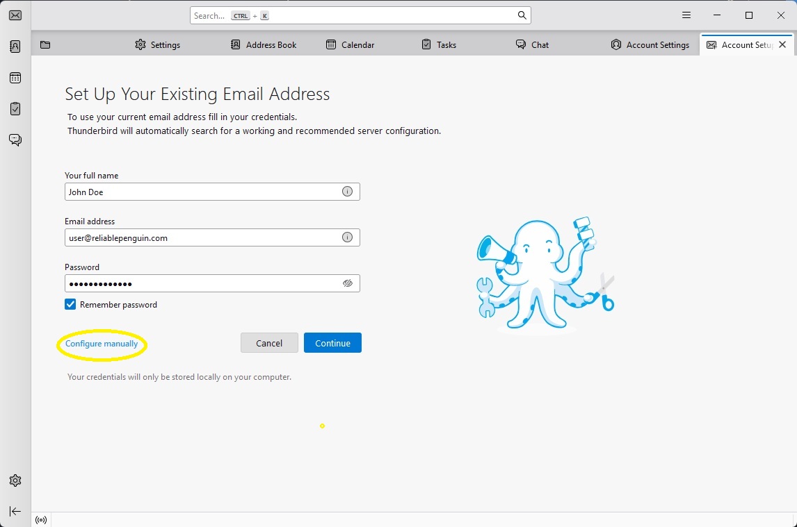 Enter your name, email address, and password and click the “Configure Manually” button to move to the next screen.