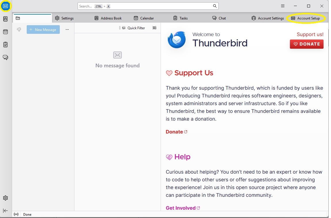 After installing, start Thunderbird and click the Mail Icon in the left hand menu. Next click the “Account Setup” icon on the far right.