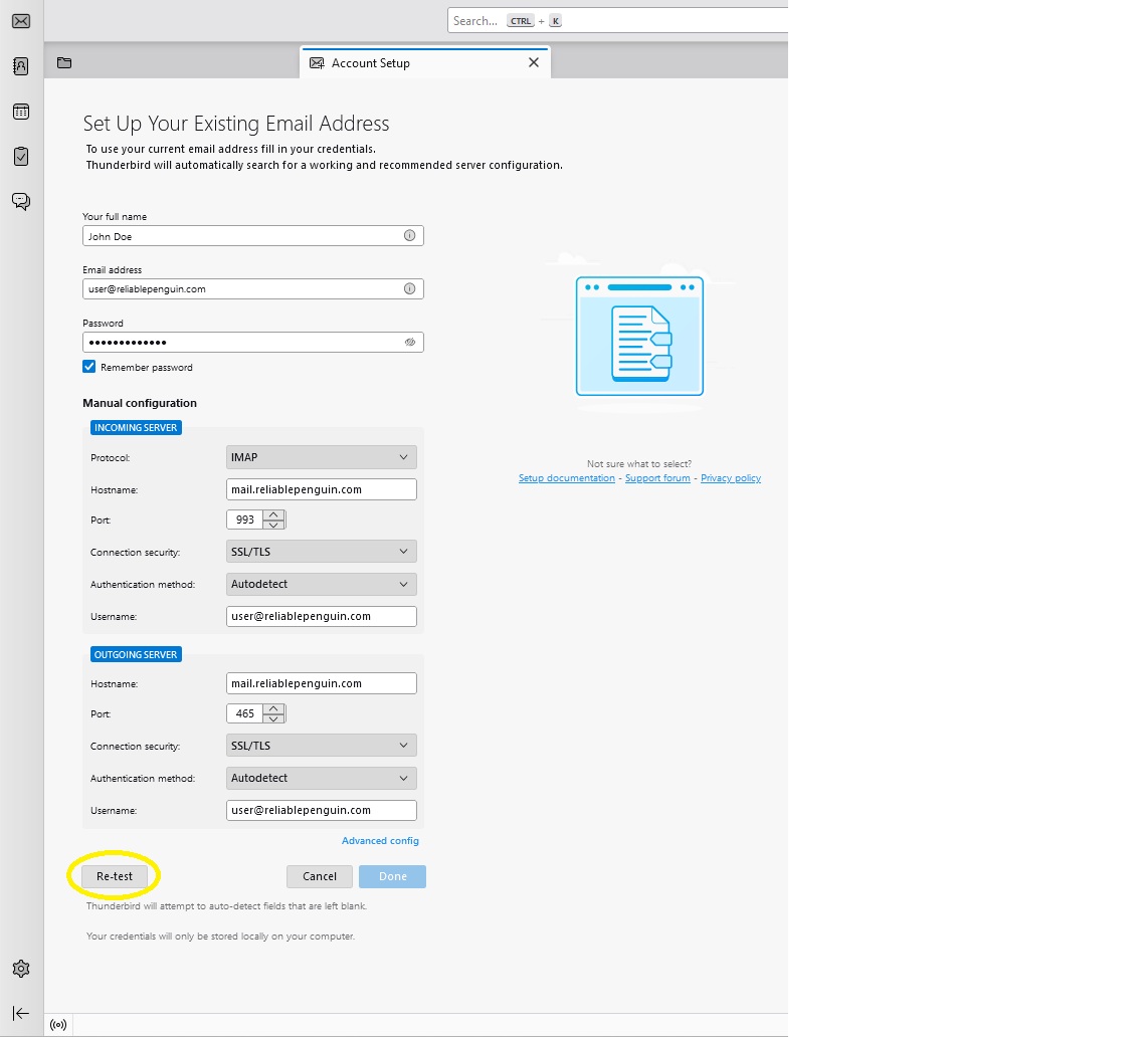 Enter “mail.reliablepenguin.com” in the “Incoming Server Hostname” field and the “Outgoing Server Hostname” field.